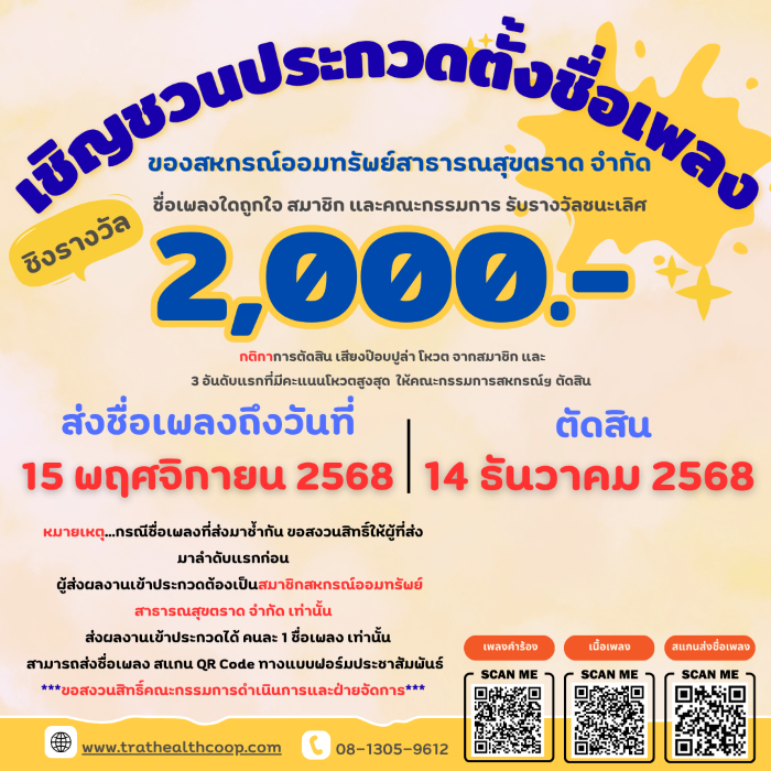 ขอเชิญชวนสมาชิกสาธารณสุขตราด ร่วมประกวดตั้งชื่อเพลงของสหกรณ์ออมทรัพย์สาธารณสุขตราด จำกัด